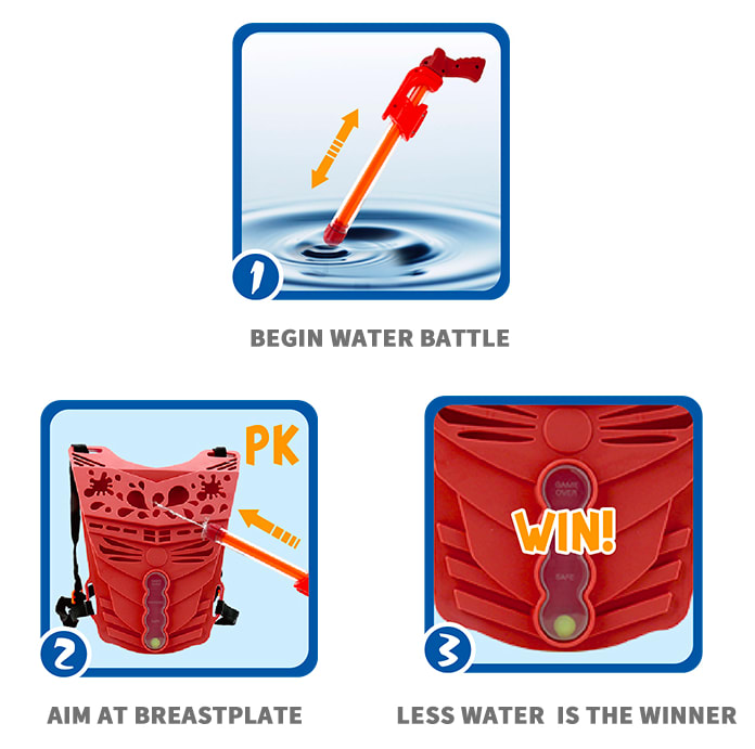 Comes with 20 vests, 20 water pistols in 2 team colours (red and blue) and Water tubs for the teams to refill their pistols.