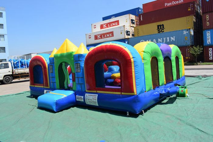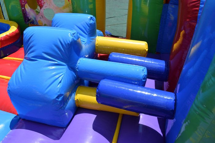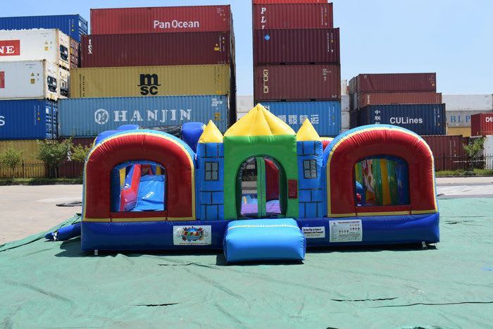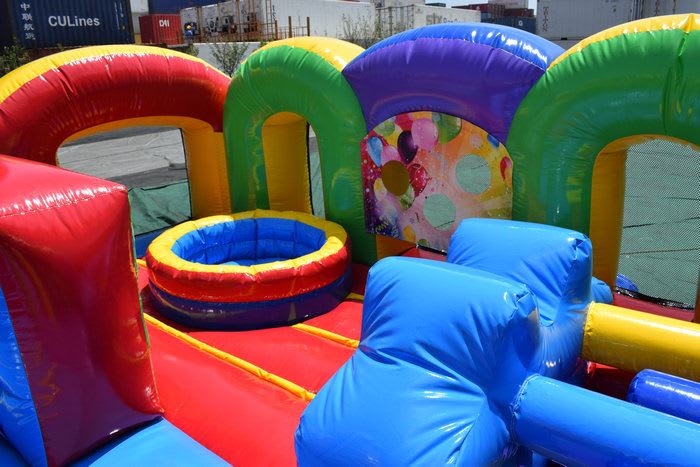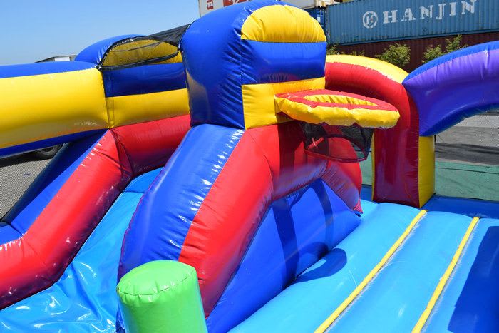 Features: Bounce areas, Velcro puzzle wall, aim game banner, inflated punching bags, obstacles, squeeze zone, inflated ball pit*, basketball ring, climb and slide!