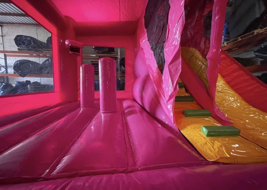 Our Pink Backyard Combo Jumping Castle features a variety of different obstacles and activities. The Backyard combo Jumping Castle, deliver maximum fun while using up minimal space! With its mesh wall front, this castle provides easy viewing for parents and lots of air flow on hot days.
