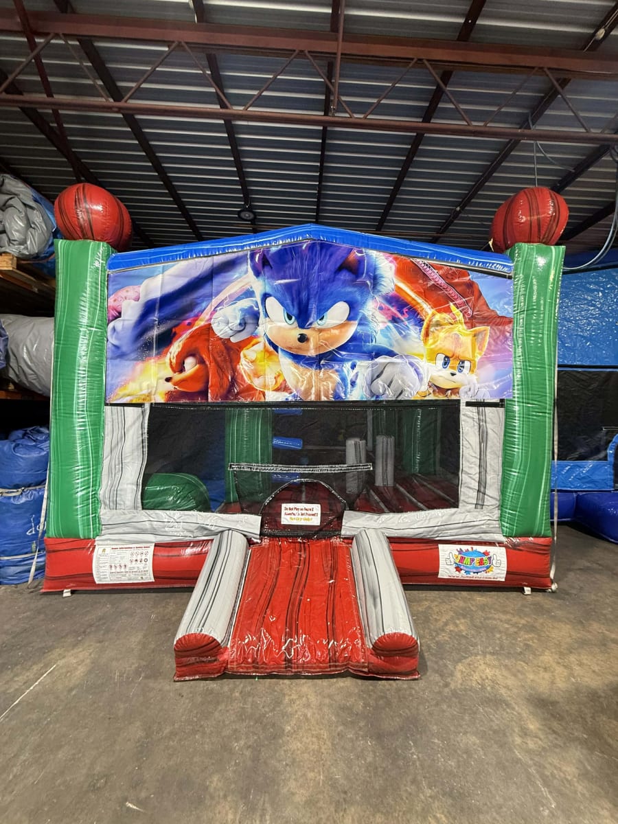 Features: Bounce area, inflated wall, inflated obstacles, stair climb, tall slide and basketball ring*.