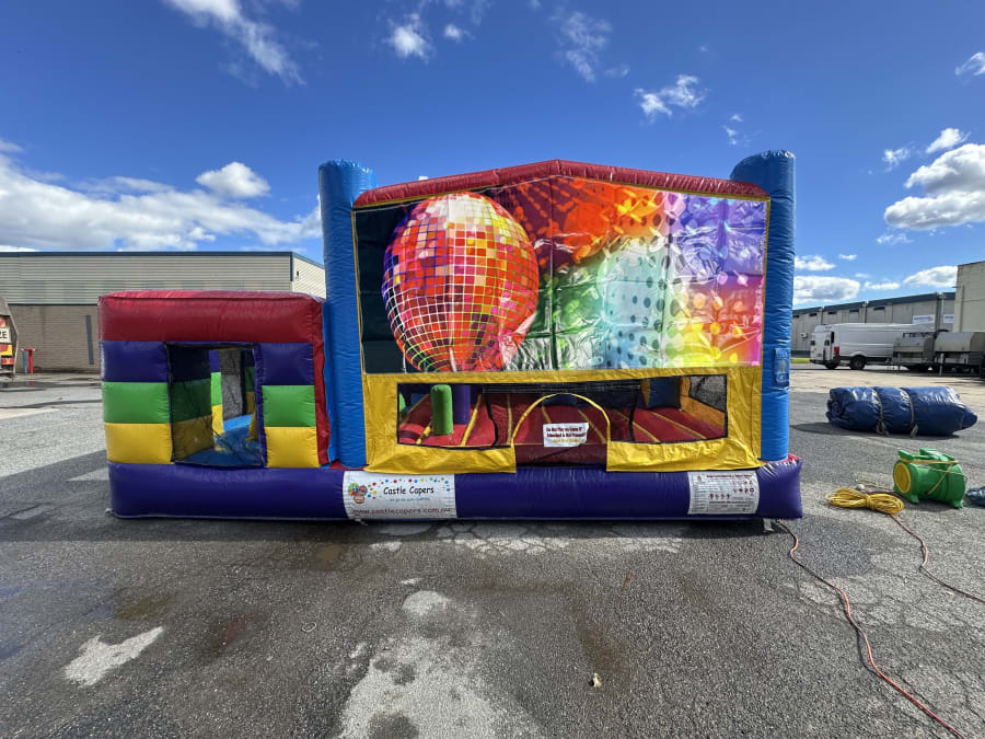 Our Disco themed Multi Challenge Combo is the ultimate inflatable for kids who want it all—action, adventure and non-stop fun. The perfect addition to any Disco themed party!