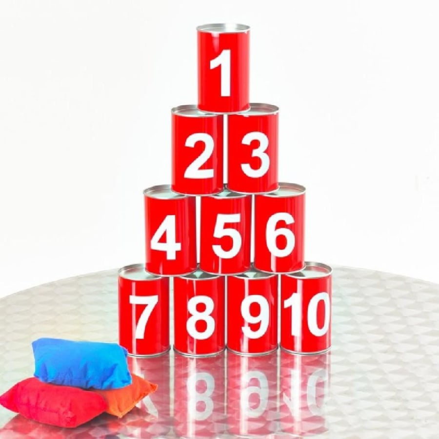 This set includes 10 brightly numbered cans and 2 bean bags. It’s compact, easy to set up and suitable for indoor or outdoor use. Great for quick-play stations, team challenges or casual fun.