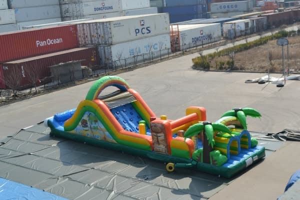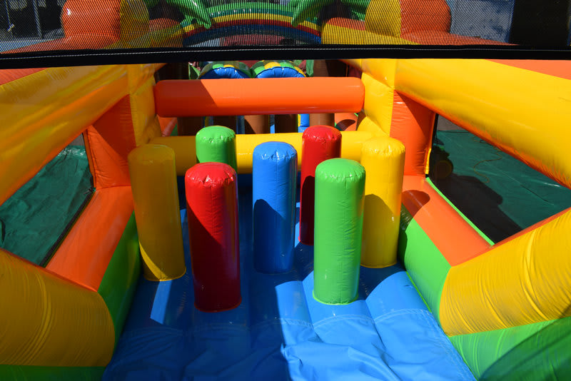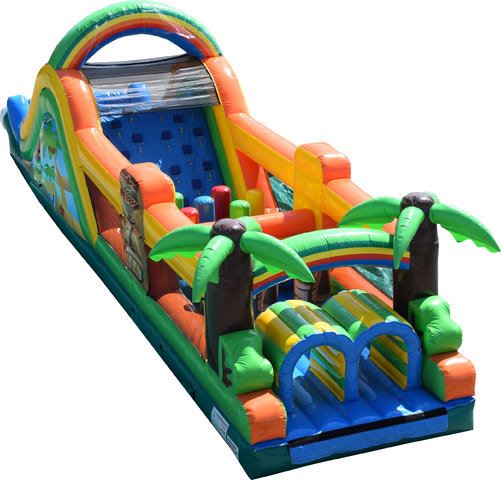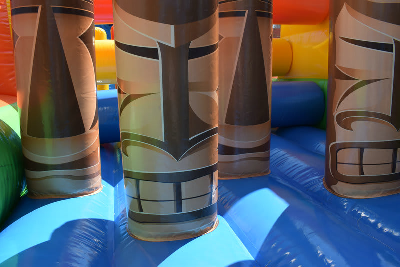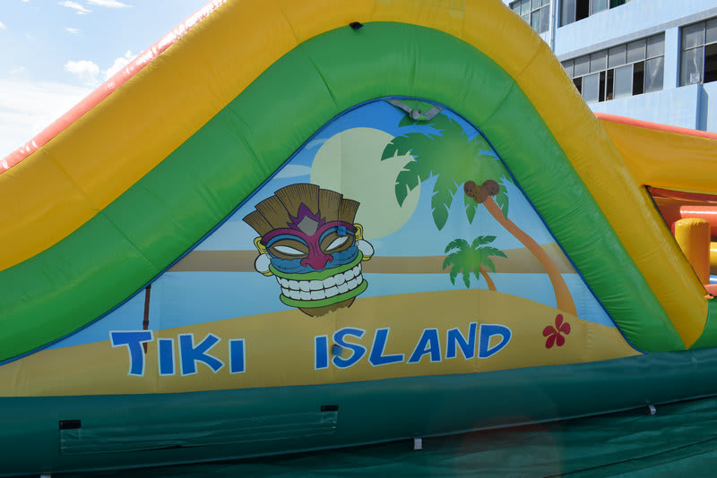 The Tiki Obstacle Course is a visual standout—featuring bright vinyl, inflated palm trees and surfboards that make it pop from a distance. This wet*/dry inflatable combines two crowd favourites: obstacle racing and water sliding, making it one of our most popular units.
