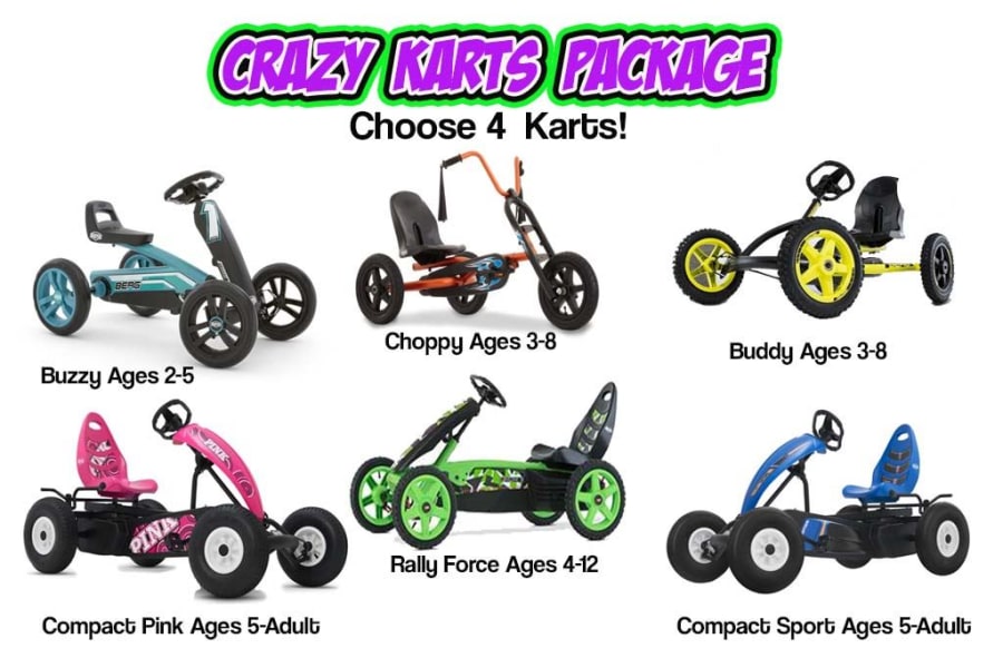 This package includes 4 pedal go karts suitable for ages 2 through adult (larger kart sizes available). Additional karts can be added for larger events. The track is compatible with our ride-on animals or your own scooters and bikes.
