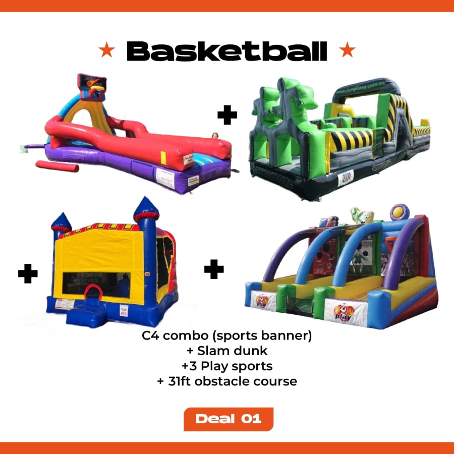 You’ll get a full-length obstacle course, multi-skill sports unit, dual-lane dunk challenge and a basketball-themed C4 Combo Jumping Castle for bounce, climb and slide action.