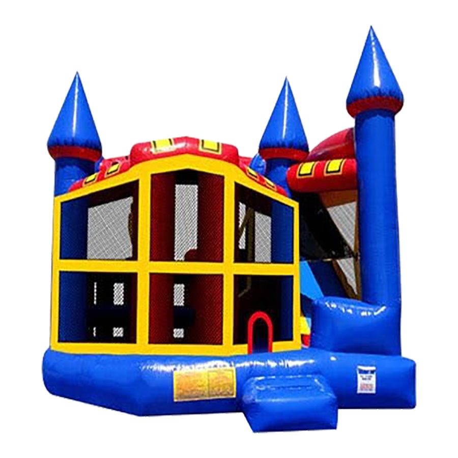 - 5-in-1 Castle – features slide, bounce zone, pop-up obstacles and basketball hoop. Available in plain or themed designs.
